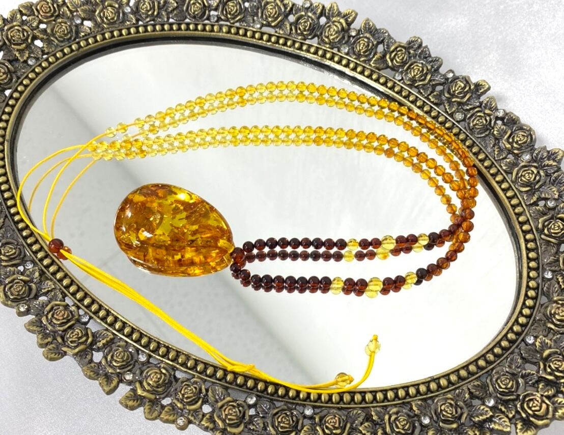 ここまで大きくて透き通った琥珀はなかなか入手できません。チェーンのところまで全て琥珀で連なっており、金属アレルギーなどがある方でも安心して身につけていただけます。