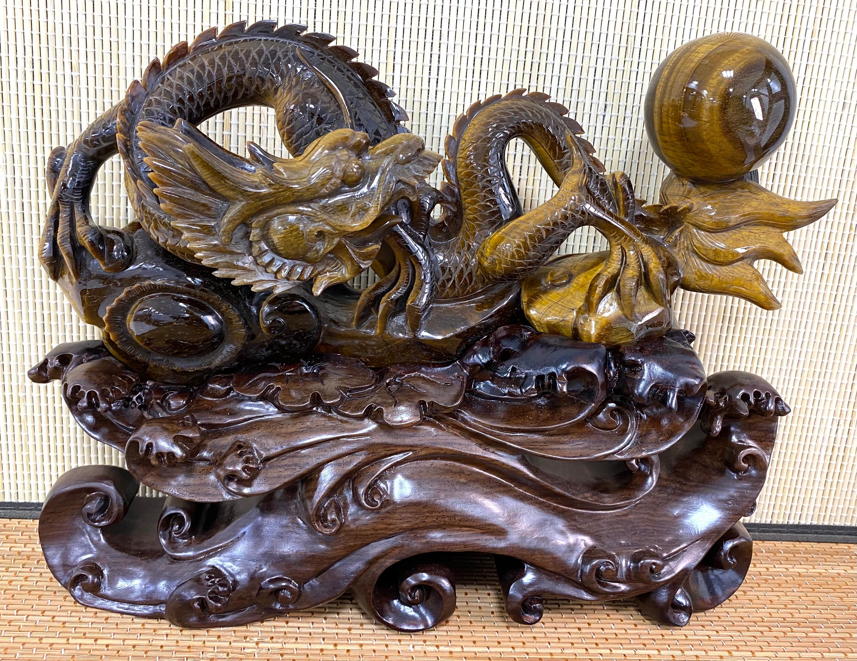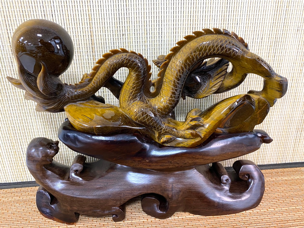 躍動感があり今にも動き出しそうな龍の彫刻です。ここまで細部にわたり細工を施した天然石の彫刻はまず日本ではお目にかかれません。また台座に関してもこの龍のためだけに彫られた大変硬くて重い木製でできています。