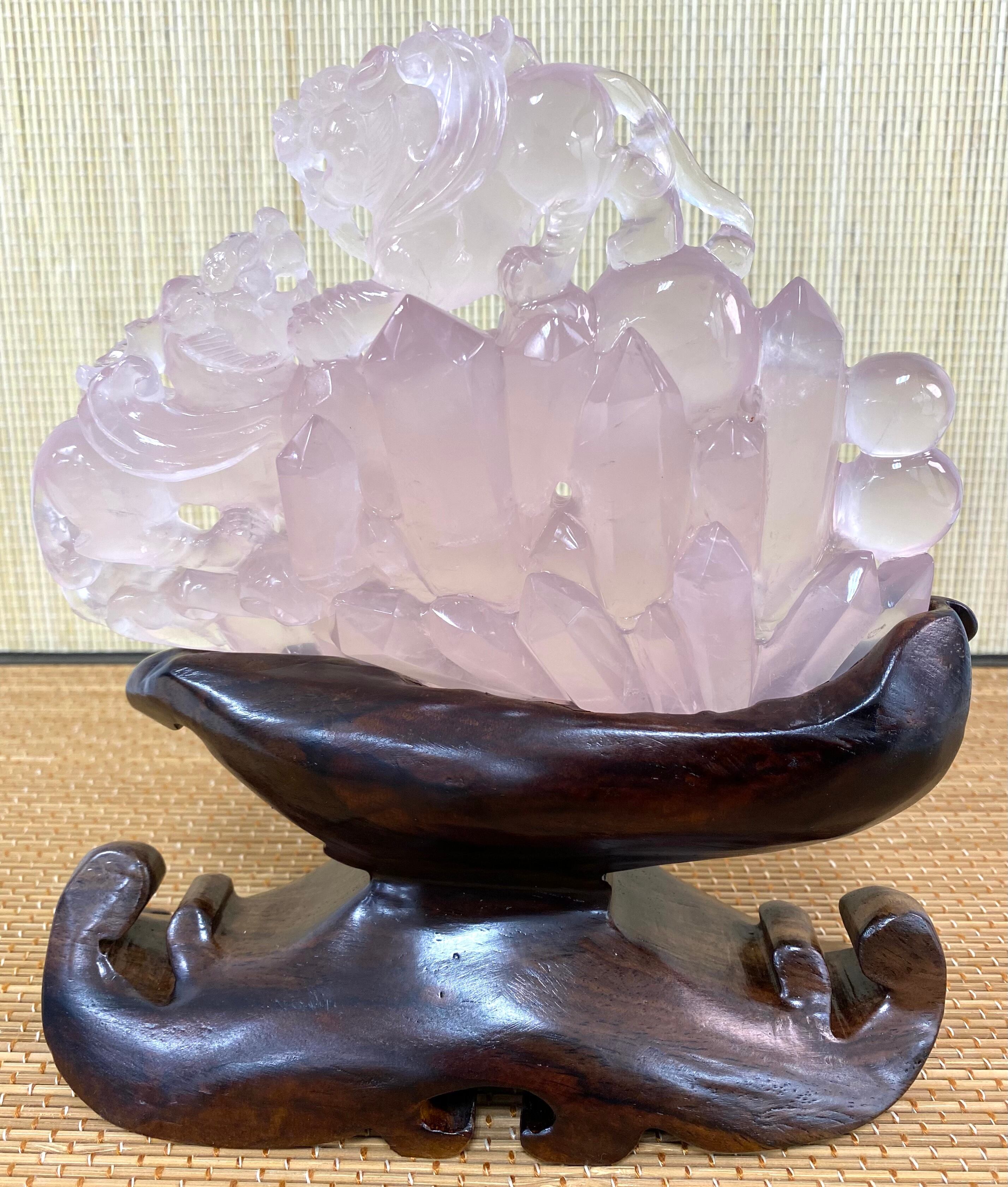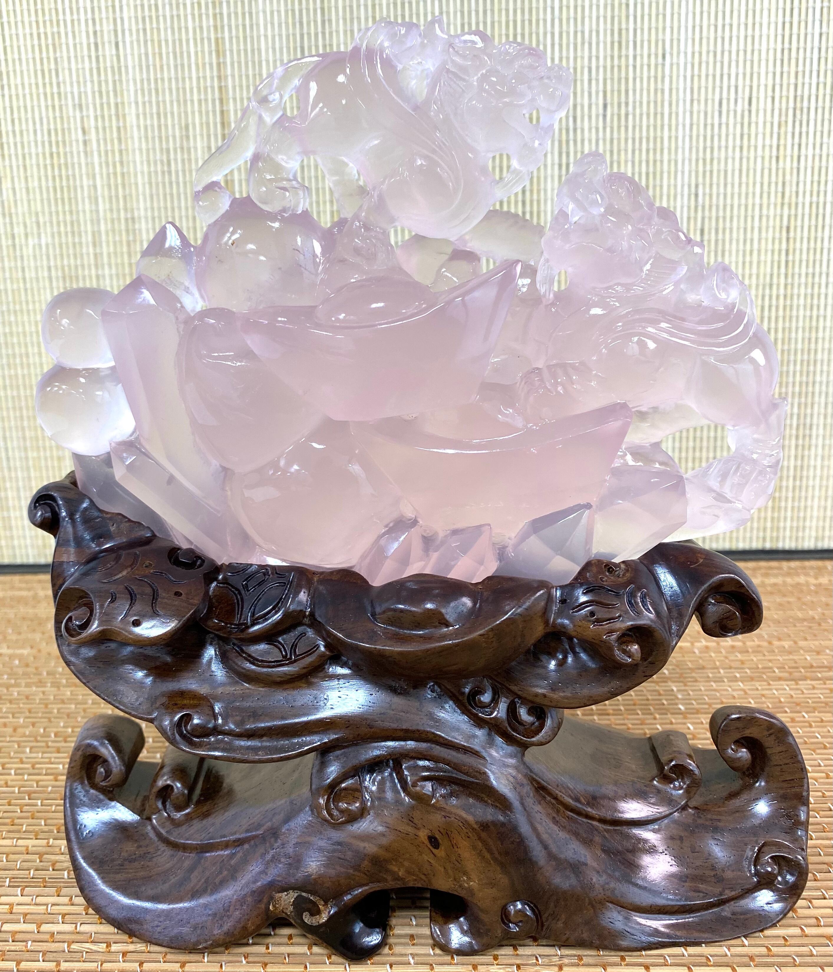 ここまで綺麗なローズクオーツで細かい細工を施している彫刻はめったにお目にかかれません。また、台座はこのヤーズのためだけに彫られた専用台座です。そのため、この台座が無いと置くことができません。木製ですが非常に重く硬い台座なので丈夫です。生涯貴方のお傍に置いてあげて下さい。