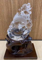 ここまで綺麗な水晶で細かい細工を施している彫刻はめったにお目にかかれません。また、台座はこのヤーズのためだけに彫られた専用台座です。そのため、この台座が無いと置くことができません。木製ですが非常に重く硬い台座なので丈夫です。生涯貴方のお傍に置いてあげて下さい。